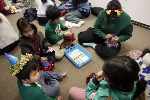まずはパーティハットにシールでデコレーション!みんなクリスマスっぽく飾りつけたね。