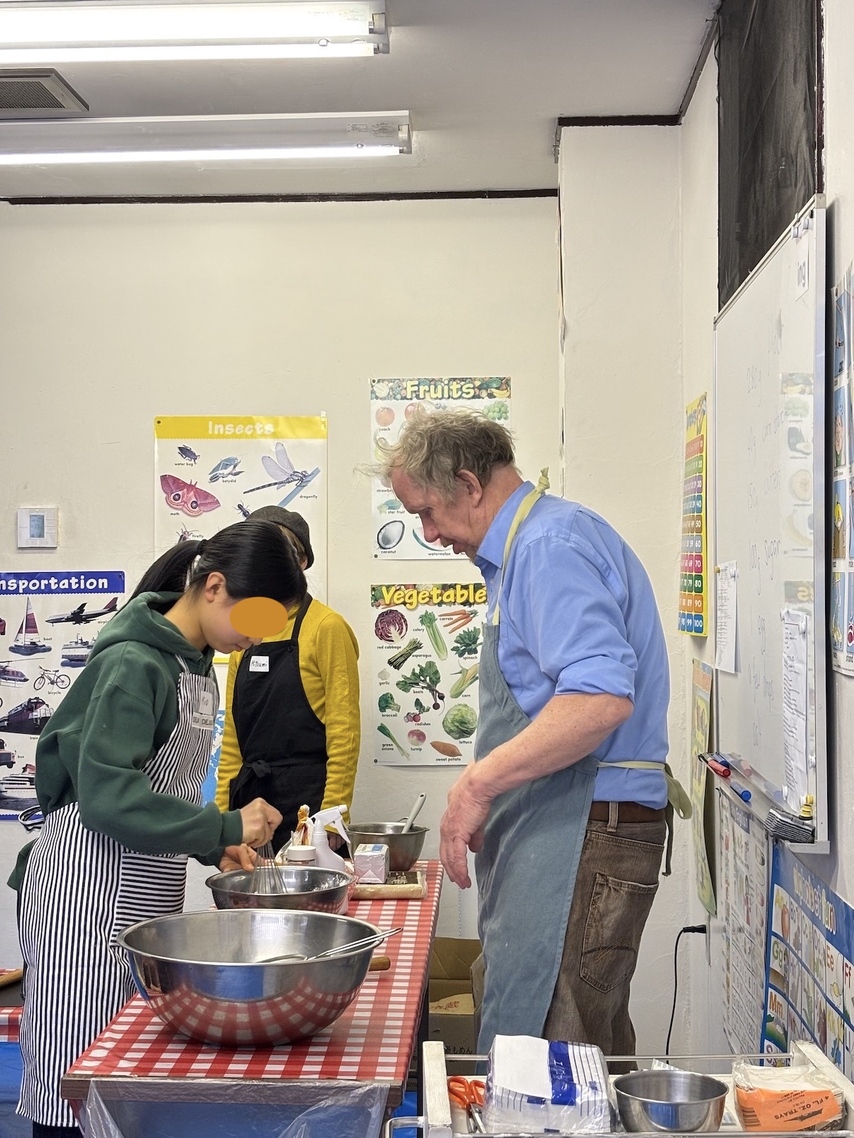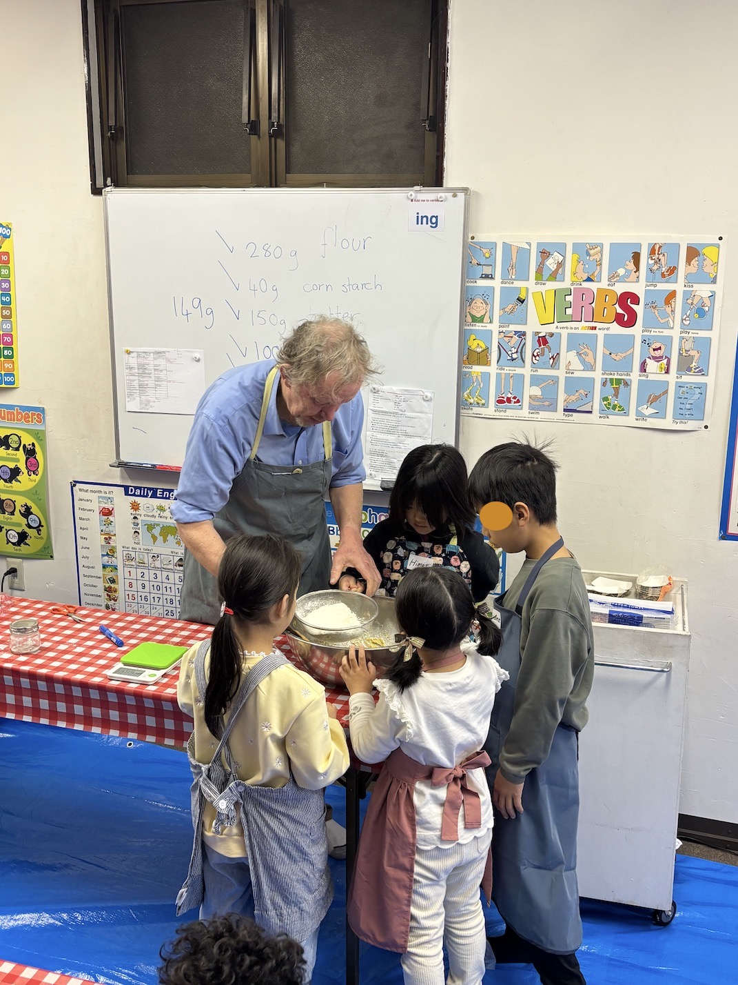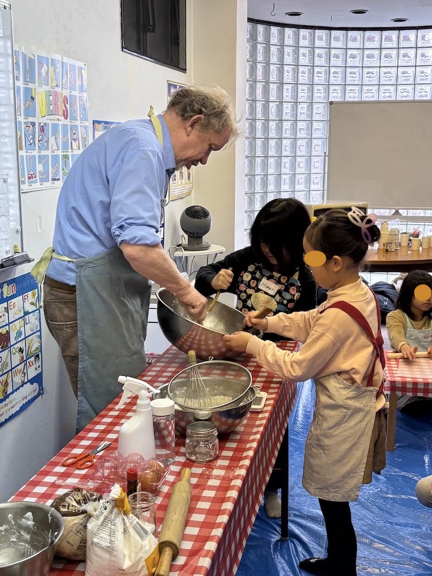 まずはクッキーの生地作りからです。大きなボールに必要な材料を計量して混ぜていきます。小麦粉、砂糖、卵・・・・、英語で言えたかな? ちなみにクッキー生地はCookie Dough(クッキー・ドウ)と言うんです。