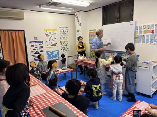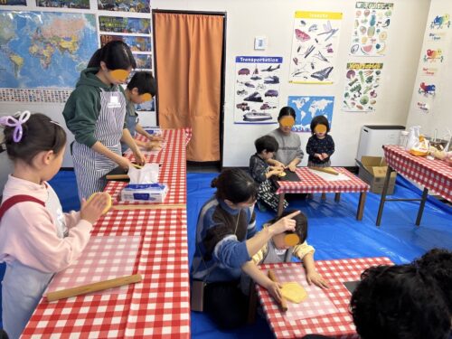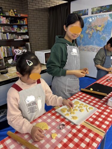 ここでみんなに一つずつ生地を渡します。ちょっと硬いけど頑張って伸ばして、ハートで型抜きをしていきます。大小さまざまのきれいなハートがたくさんできました。余った生地で自分のオリジナルの形を作ってみる子もいましたよ。