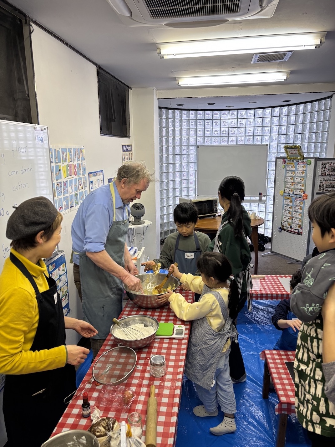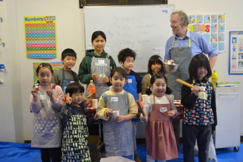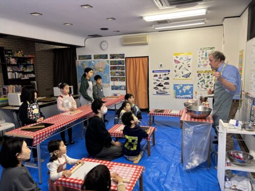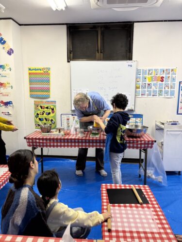 まずはクッキーの生地作りからです。大きなボールに必要な材料を計量して混ぜていきます。小麦粉、砂糖、卵・・・・、英語で言えたかな? ちなみにクッキー生地はCookie Dough(クッキー・ドウ)と言うんです。