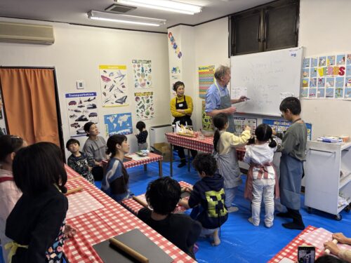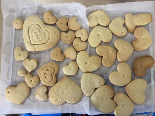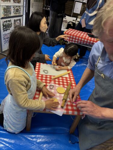 ここでみんなに一つずつ生地を渡します。ちょっと硬いけど頑張って伸ばして、ハートで型抜きをしていきます。大小さまざまのきれいなハートがたくさんできました。余った生地で自分のオリジナルの形を作ってみる子もいましたよ。