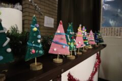 今年の工作は、毛糸でクリスマスツリーを作ります。厚紙に好きな色の毛糸を巻いて飾りをつけたら、世界に一つだけの